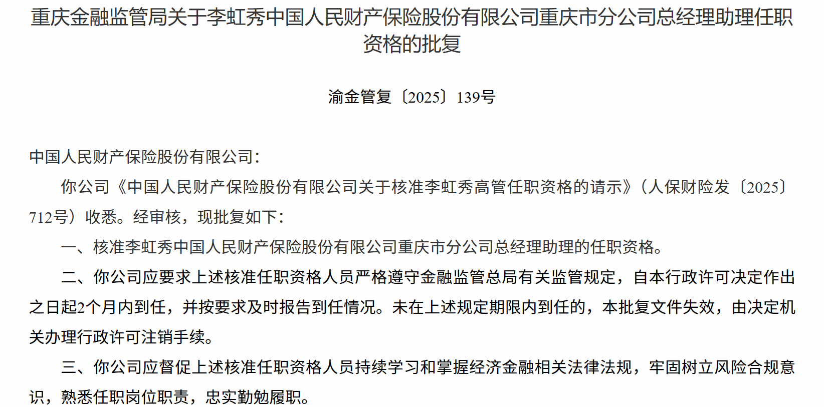 12月5日,重庆金融监管局发布关于李虹秀中国人民财产保险股份有限公司重庆市分公司总经理助理任职资格的批复,核准李虹秀中国人民财产保险股份有限公司重庆市分公司总经理助理的任职资格。